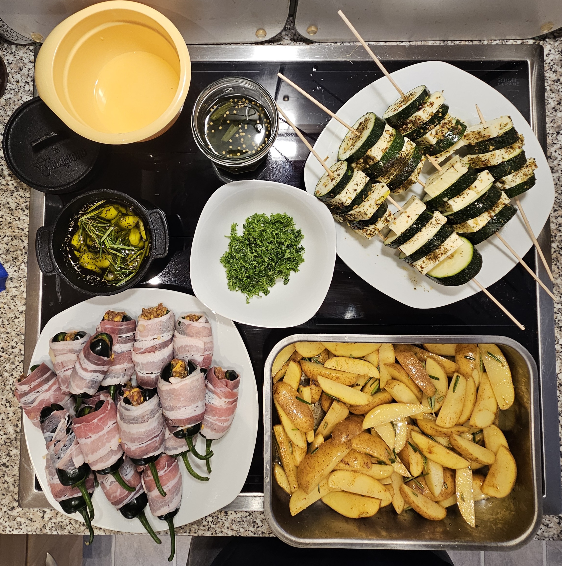 Die ersten 3 Rezepte habe ich getestet und daraus dann eine Kombination auf den Tisch gebracht. Auf den Bildern sind die Zutaten, Zubereitung und Ergebnisse folgender Rezepte zu sehen: