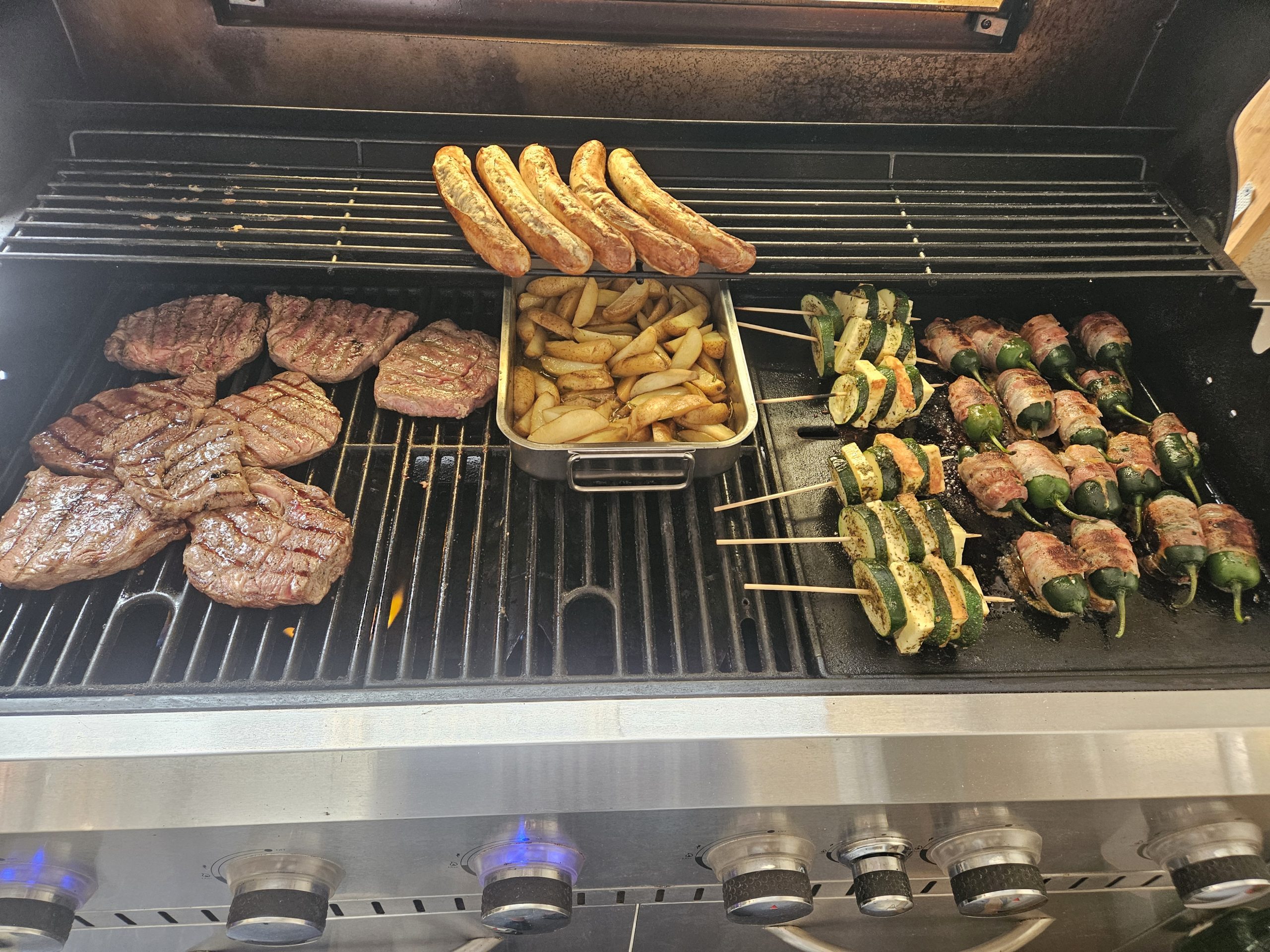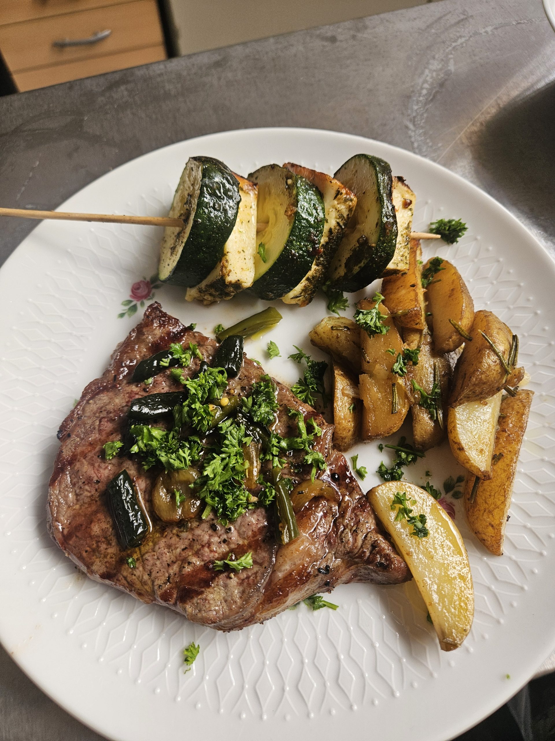 Rib-Eye-Steak mit Halloumi-Zucchini-Spiessen und Cowboy-Candy